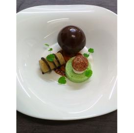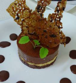 L'un de nos desserts parmi les plus appréciés est le trianon ou appelé aussi Royal chocolat. Son originalité réside ici dans les parfums associés au chocolat noir. L'olive apporte cette touche, à la fois subtile dans la mousse et plus marquée dans les tuiles caramel...